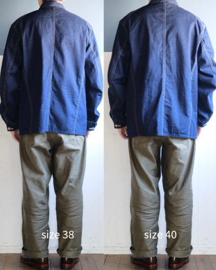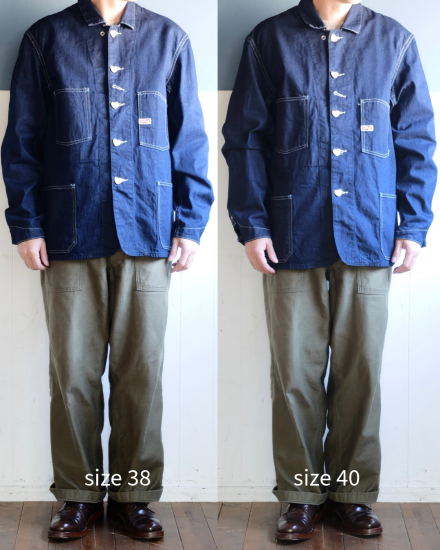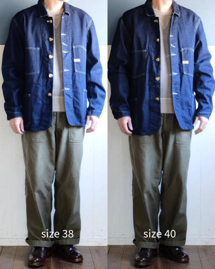 RYO(写真5~7) サイズ42着用 180cm 90kg インナーにパーカーやLined jacket なら少しのゆとりをもって着られるサイズ。 パーカー+Gジャン+カバーオールとなると、サイズ44でないと着られません。